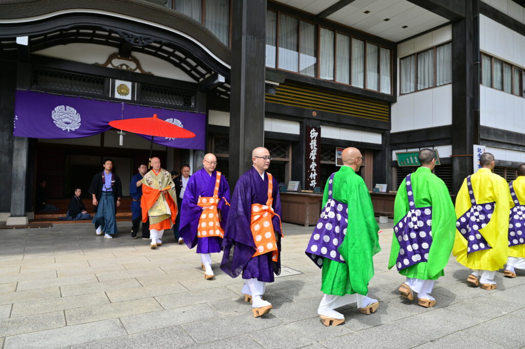 次に黄色の方が、その次に緑の方、そして紫の僧正さまと続き、最後にお出ましになったのが、橙の袈裟をかけた傘をさしかけられている大僧正様。
