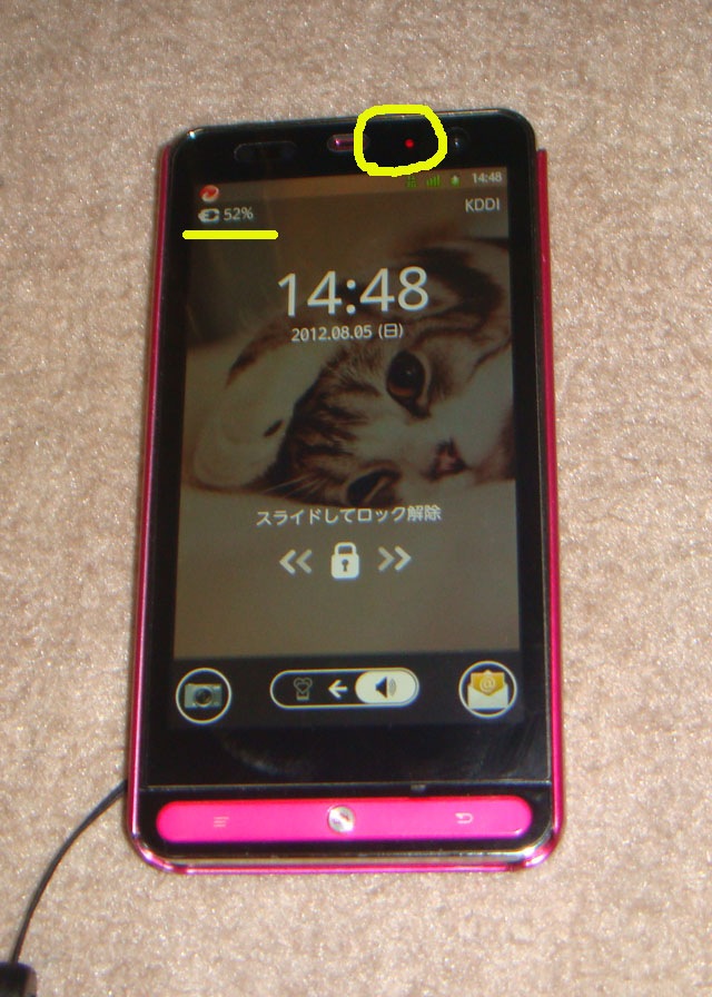 結果は。。。おねえさんの言うとおり、いったん充電器(卓上ホルダ)に取り付けてまたはずすと、もう充電ランプは消えたし、充電割合は表示されなくなり、電池の形をした矢印アイコンも動かなくなった。あ、こんな簡単なことで治るんだ。この後は電源オフして電池パックを外し、できればICカードも外してもう一回入れ直し、冷えたら元に戻して、という作業をするように言われた。そうやってもまた今後、何度か同じようなことが繰り返されるのであれば、auショップ行きだって。