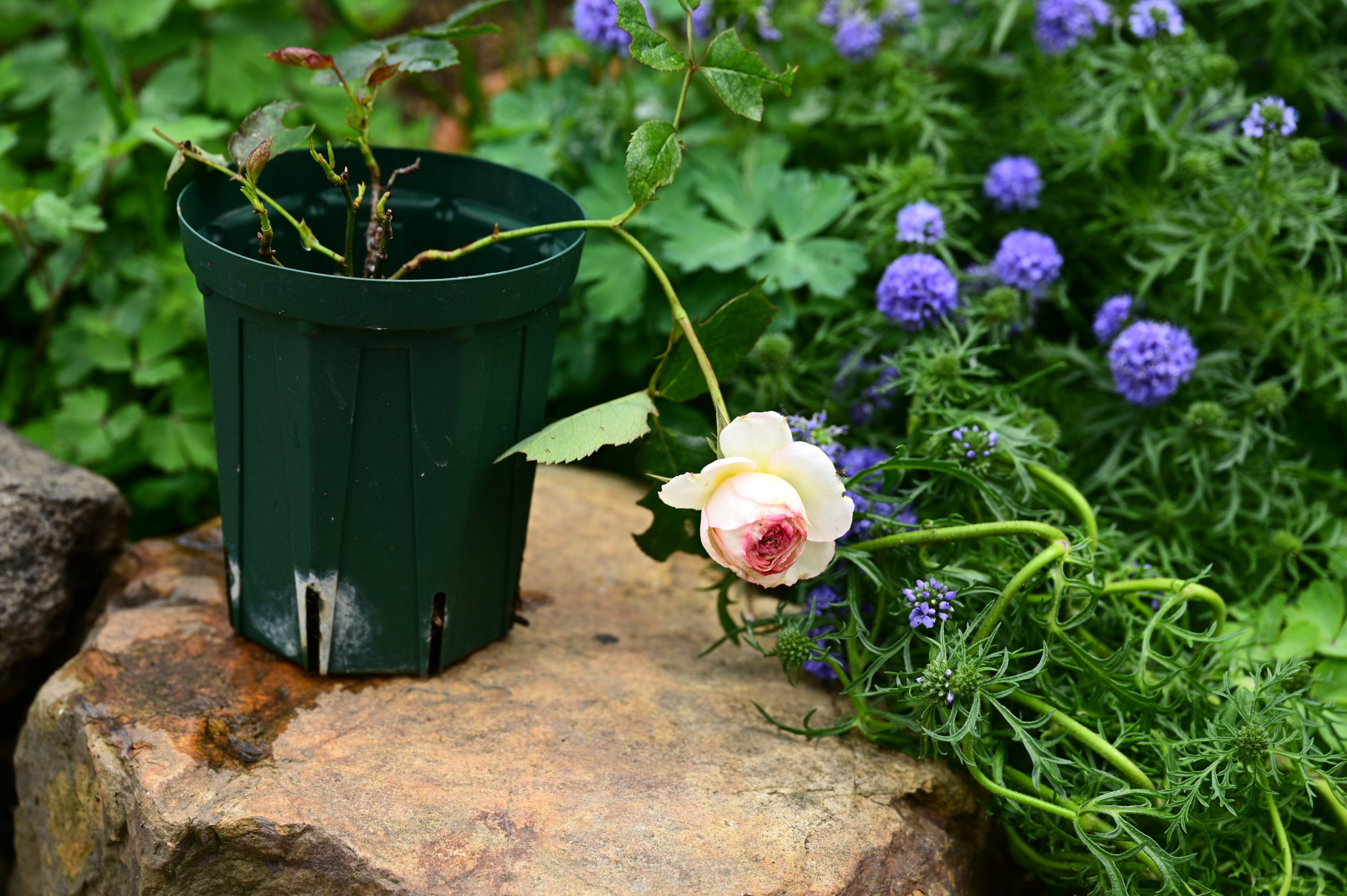 ⬆何年か前に掘り上げてしまった株で、少し生き残っていた根の部分をポットで育てていた。大きい方の残った根は別の場所に地植えしておいたが今年は抜いてしまった。気の毒だった。ポットで育てていた株も病気なんだろうと思っても、捨てる気になれなかった。それが今年蕾を付けて開花となった。だが、買いなおしたほうが生育が良いのは分かっている。根が素直に育っていないと地上部もうまく育たない。生産者さまさま~。