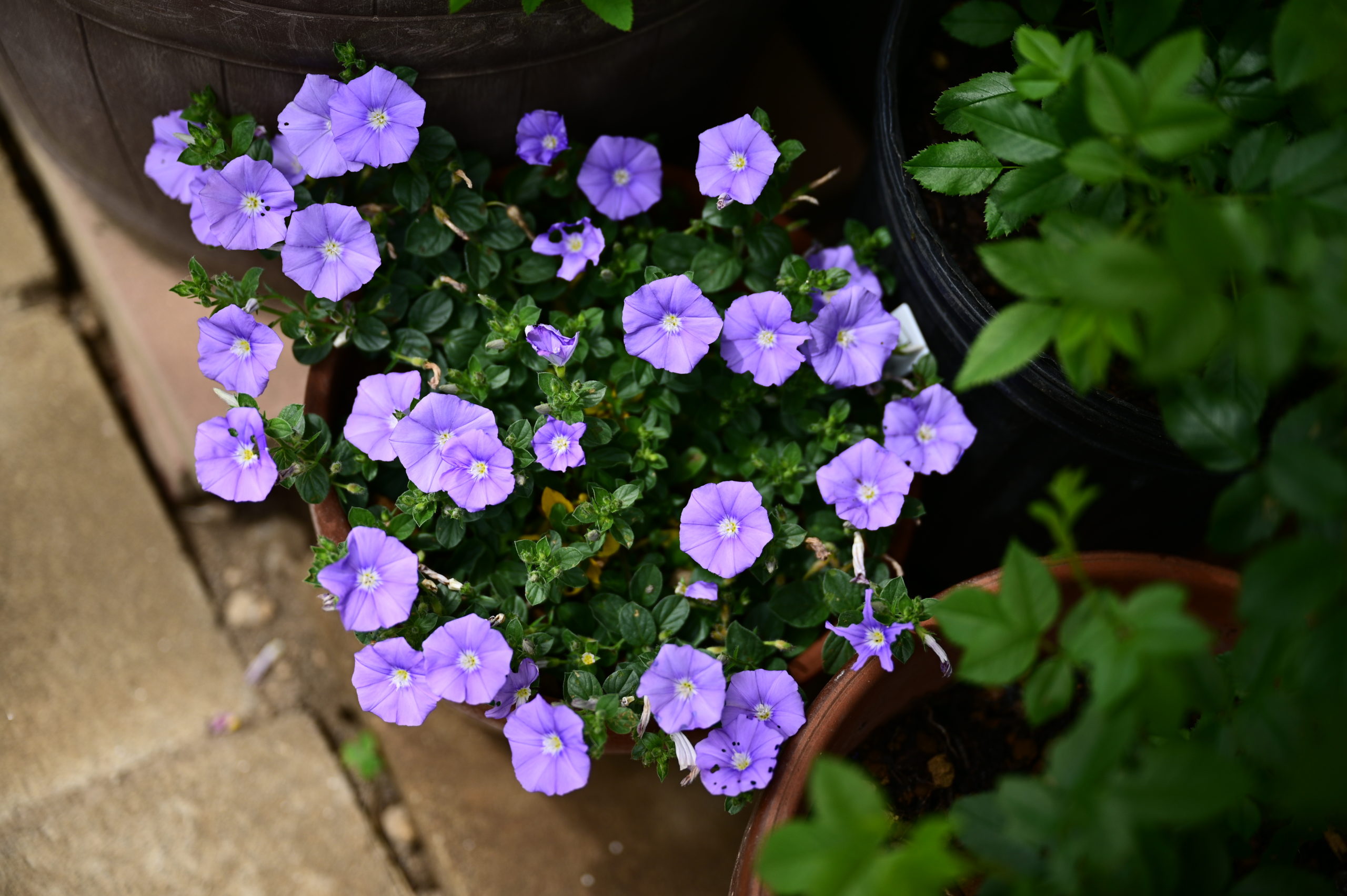 ⬆コンボルブルスは今年、大幅に減少。良く咲いていた場所はさっぱり抜いてしまったから。とても寂しい。他の場所に植えてある株はまだまだ蕾が見えないのに、この鉢植えだけはどんどん咲き続けてる。この株はポットで育てていたのを少し前に鉢植えとしたもの。