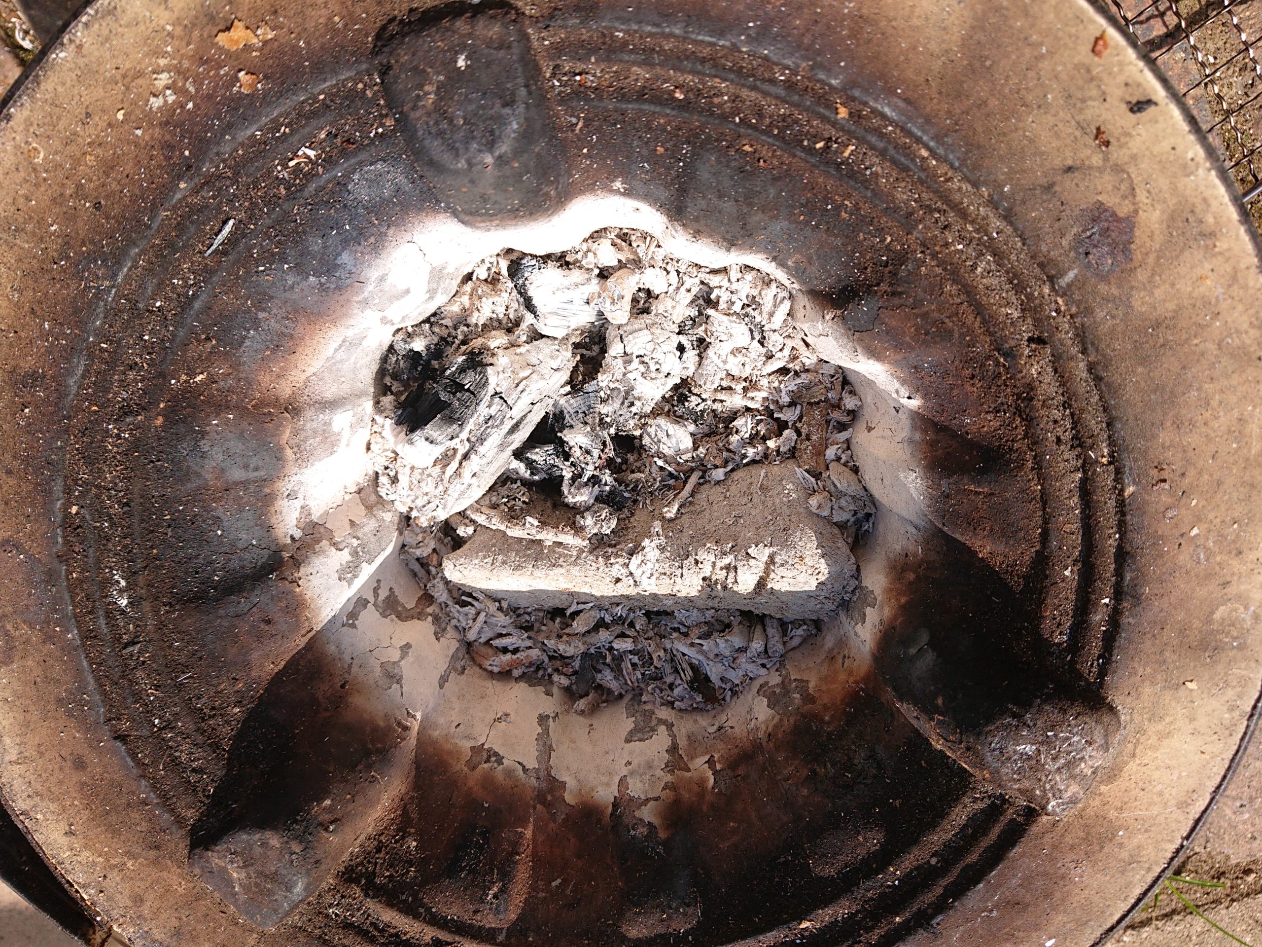 真ん中に、20分使えるという青い固形燃料、周りにオガ備長炭は1本だけで後は消し炭を詰めた。