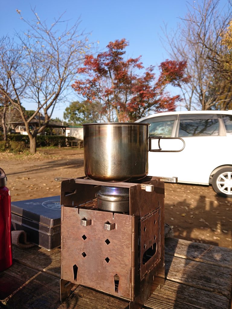 焚火は杉っ葉を一枝と、ほぐした麻紐に落ちていた枯れ葉を一つかみ。ナイフとファイアスターターであっけなく着火。あとは割りばしのとっておいたものと細く割った針葉樹系の薪。薪はキャンプ場では高いのでカインズで広葉樹系の小さい箱入りを買ったが、値上がり品薄状態で大きい束は予約品となっていた。