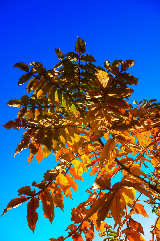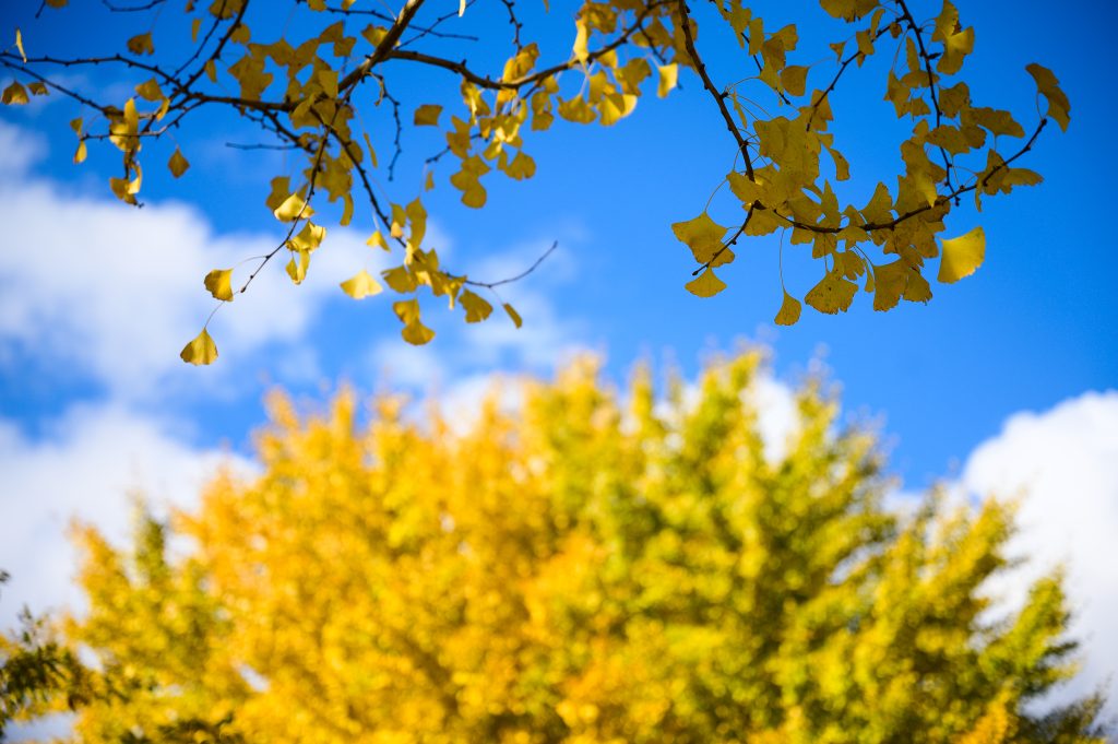 (下:イチョウの枝下から奥のイチョウを望む f/2.8 1/2500 70mm ISO100)