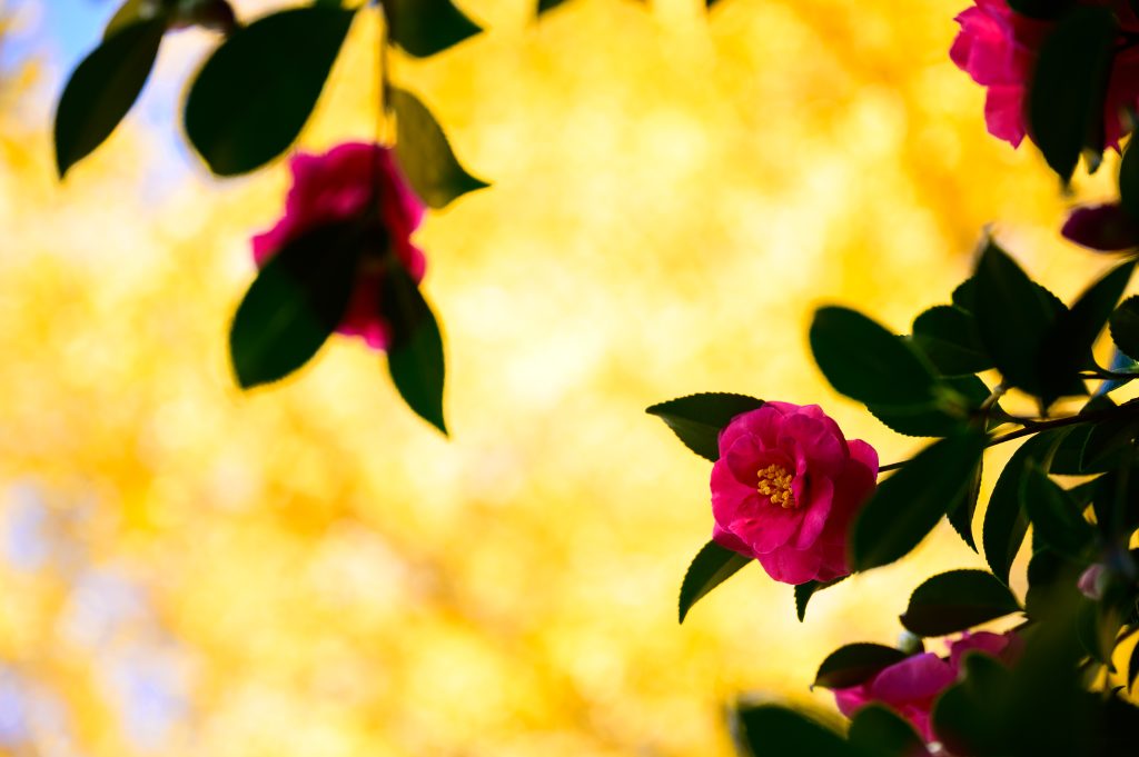下は印旛沼サンセットヒルズで撮った数枚。まずはイチョウを背景にしてサザンカ。陽に当たったイチョウはまぶしいまでに輝いていた。もっと絞ってイチョウの葉を少し分かる程度にしたほうが良かっただろうか。なんでこの時、f値を変えなかったかと悔やむ。