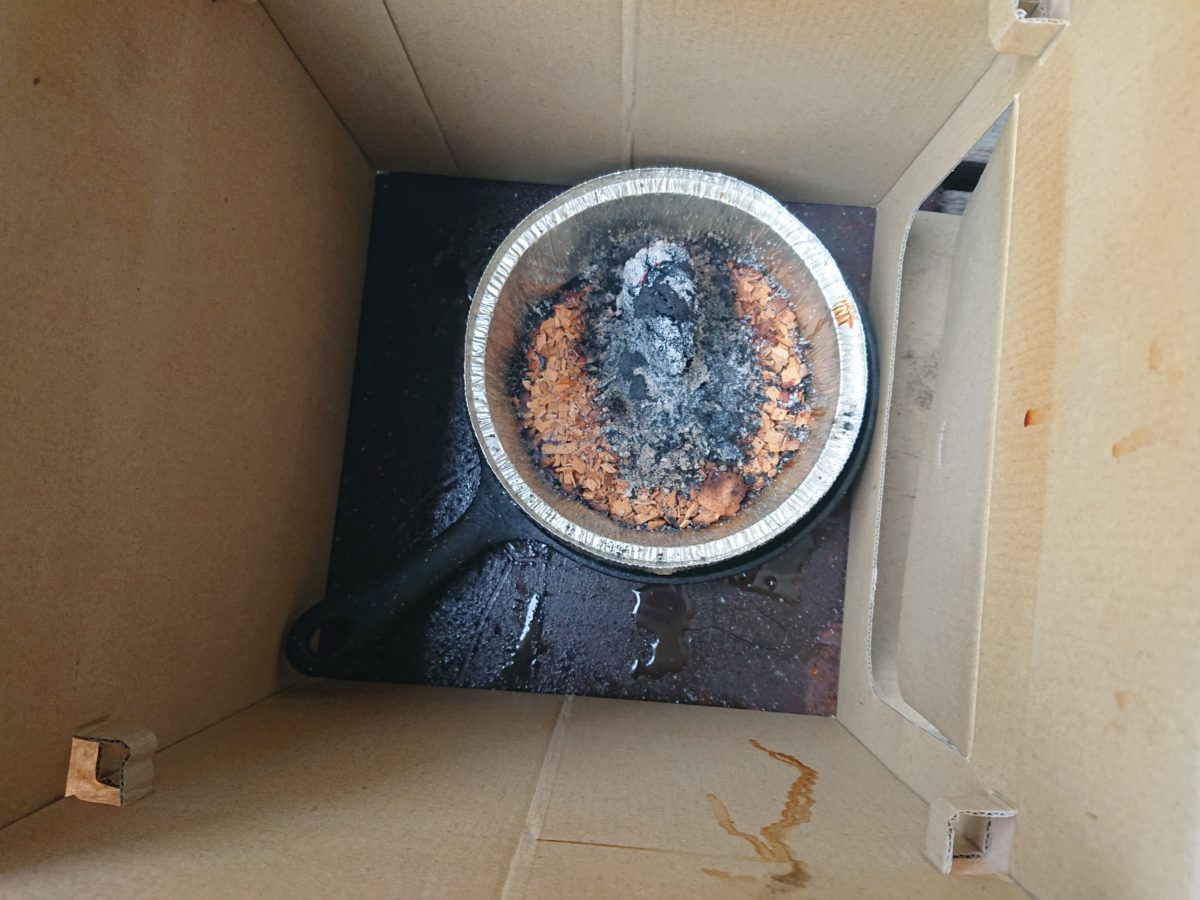 長いガスコード使用の上、宅内キッチンからの天然ガス一口ガスコンロでやったり、カセットのプロパンガスコンロでもやったが(縁台で)、弱火にすると火が見えなくて危険だったので今回はあきらめた。一般的には電熱器使用が多いらしい。炭だと温度設定が難しいよね。とにかく段ボールでは小さいのでせいぜい30分の燻煙時間そばに付きっきり。