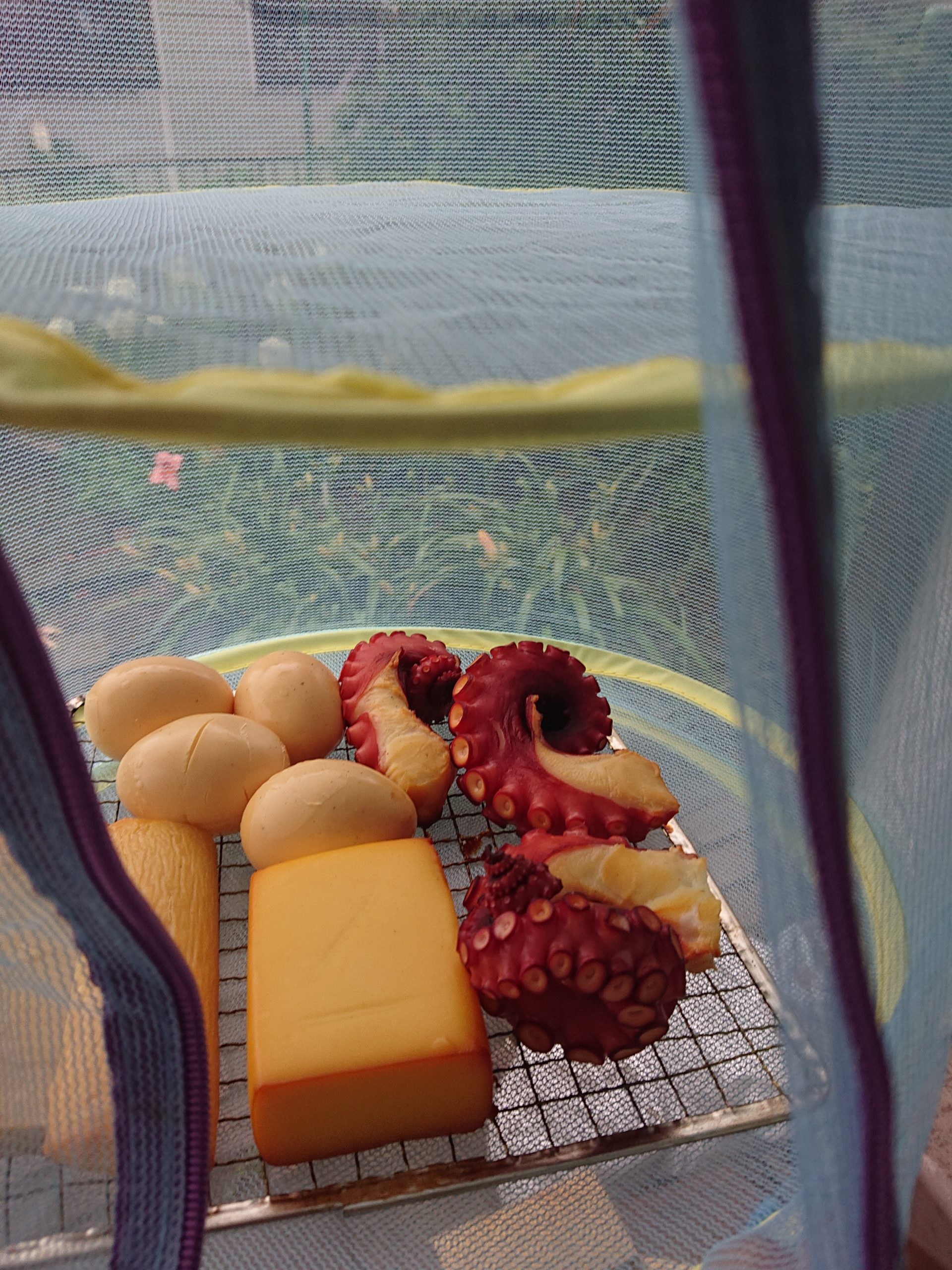 初回が失敗したのは、火(熱源)からウッドチップと食材までの距離とか、燻煙時間とかが本と違っていたからだろう。初めからうまくいくと思ってなかったが。 2回目は加熱の必要が無いものばかりで燻煙だけ(冷燻)だったし、一応は成功したのでまずまずの気分。