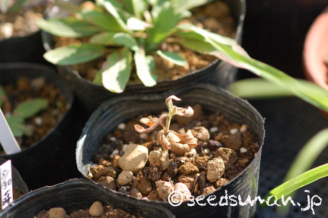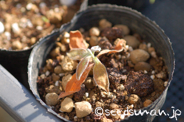 10センチほどに育って生長の良いものからポット上げしたが、根をいじったのが原因か次々に枯れてしまった。もうポット上げせずに、そのまま蒔き床で冬を越させようと思う。春になったら根をいじらぬようにして植え広げしようか、と思う。多数発芽しているので安心していたが、やはりインカヌス種のようにはいかないらしい。親葉が出るころには茎が赤くなって、インカヌスと違うのが分かった。