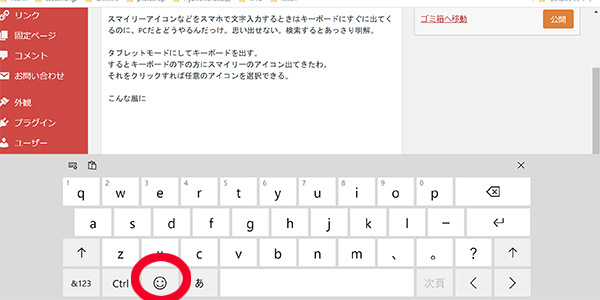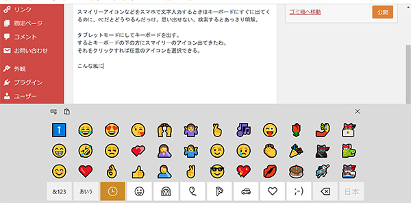 スマイリーアイコンなどをスマホで文字入力するときはキーボードにすぐに出てくるのに、PCだとどうやるんだっけ。思い出せない。検索するとあっさり答えが。