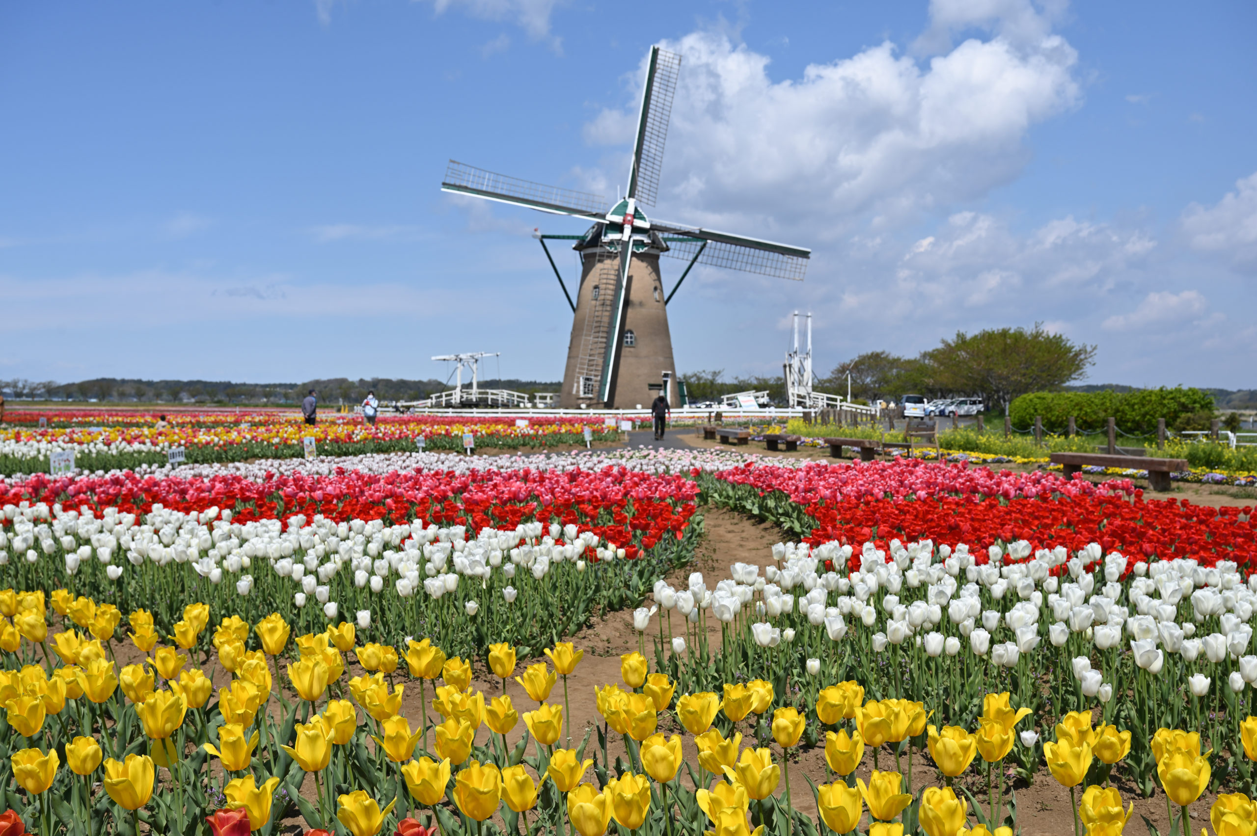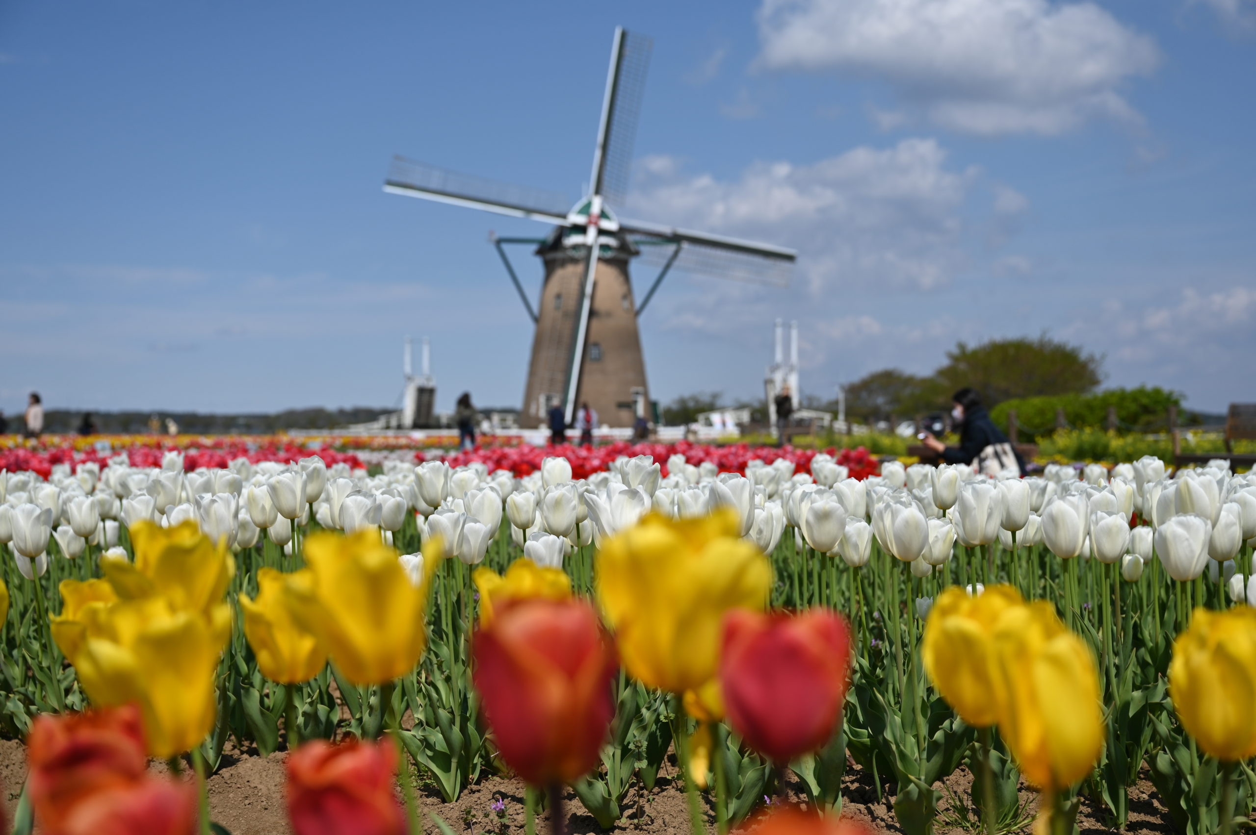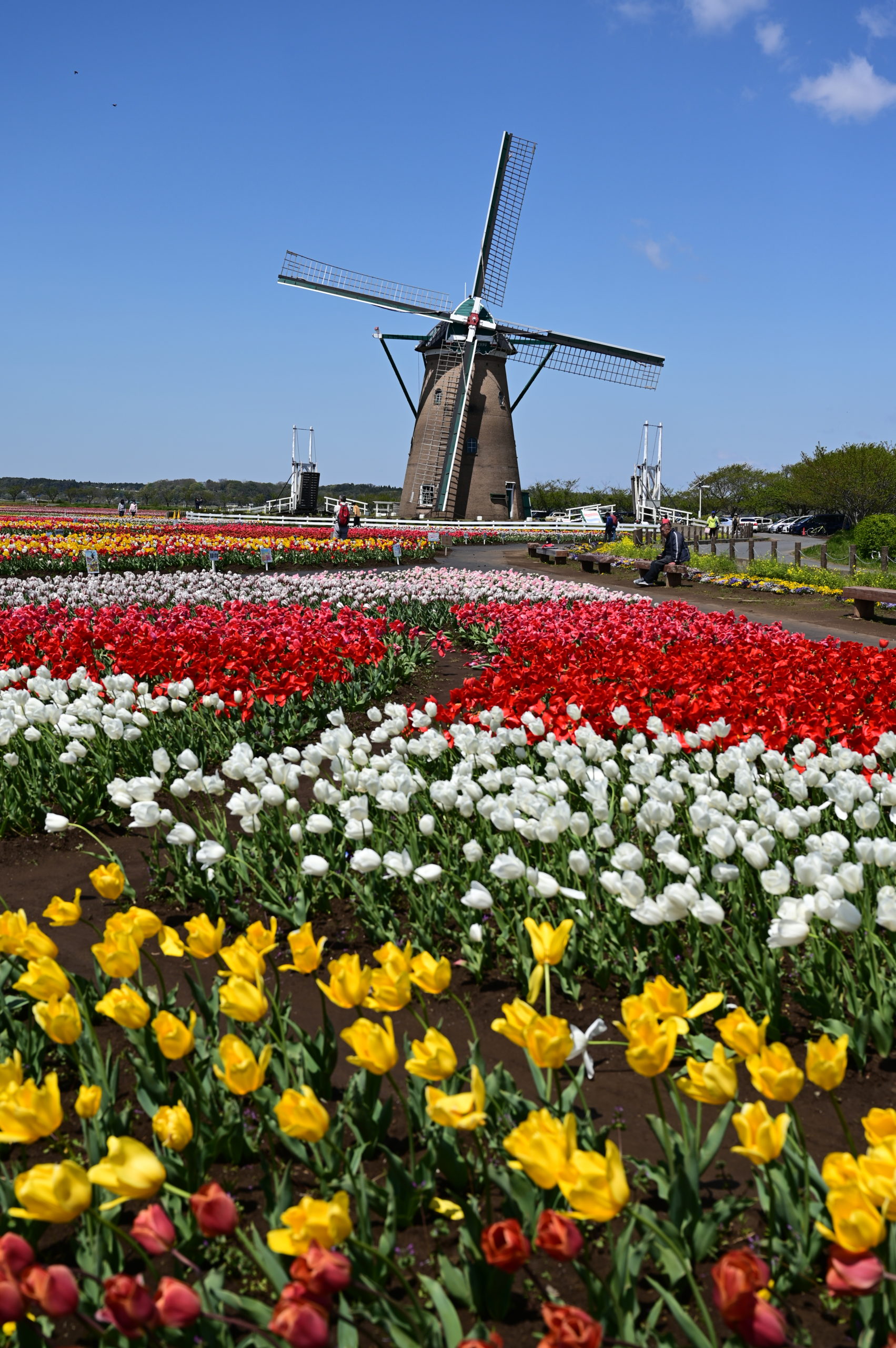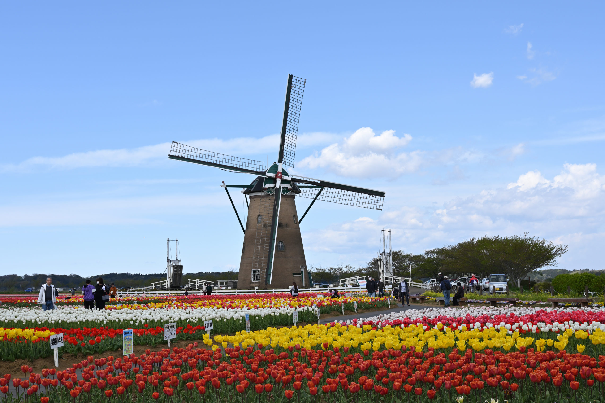 広大なチューリップ畑と大きな風車をどうやって一枚に撮ったらいいか悩む。この風車のすぐ左には大きな高圧鉄塔がそびえたっているからだ。その鉄塔を移動できないのかといつも思うが、広大な田圃であったろうその場所を市で借り受けているのかも。