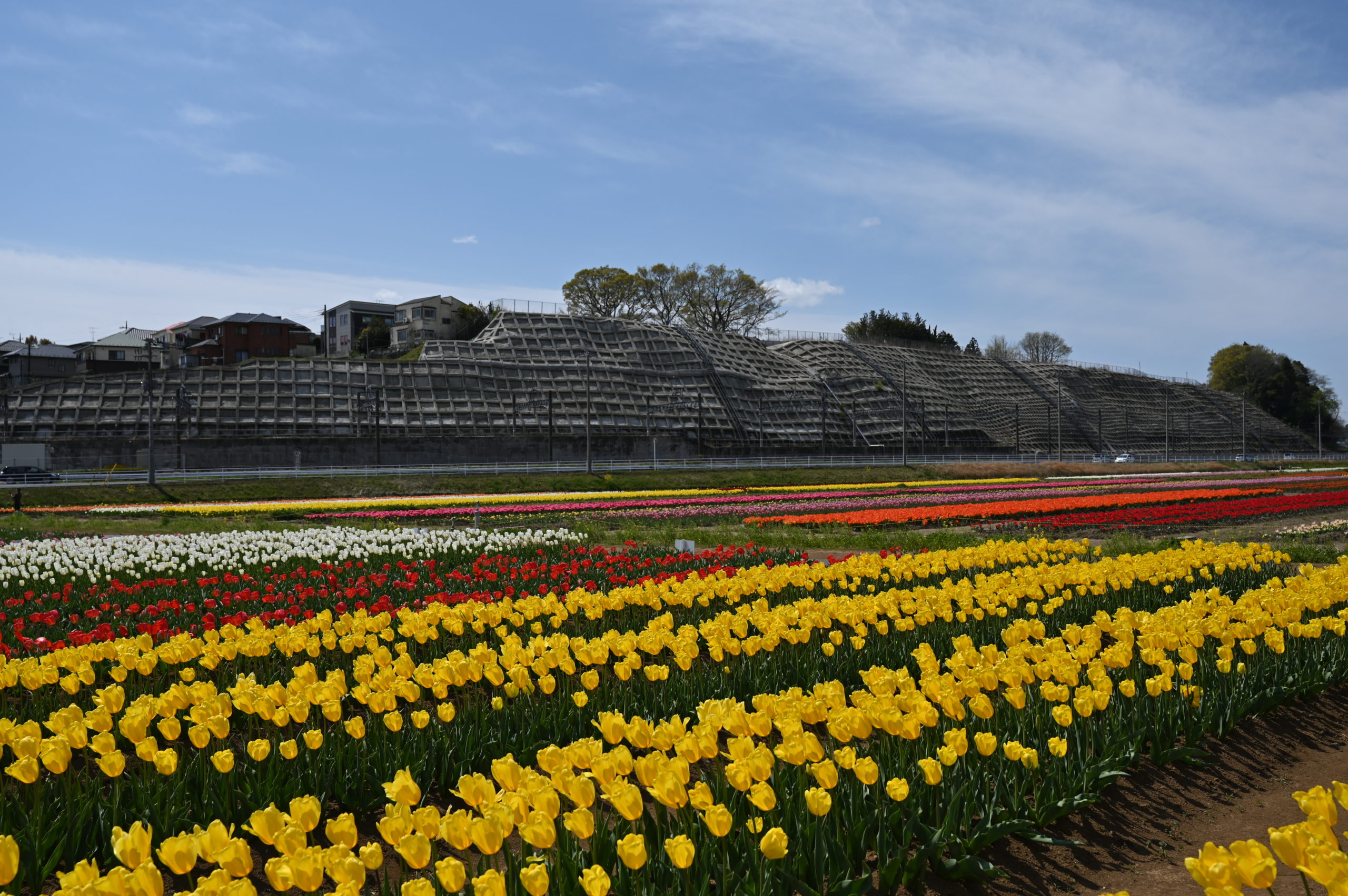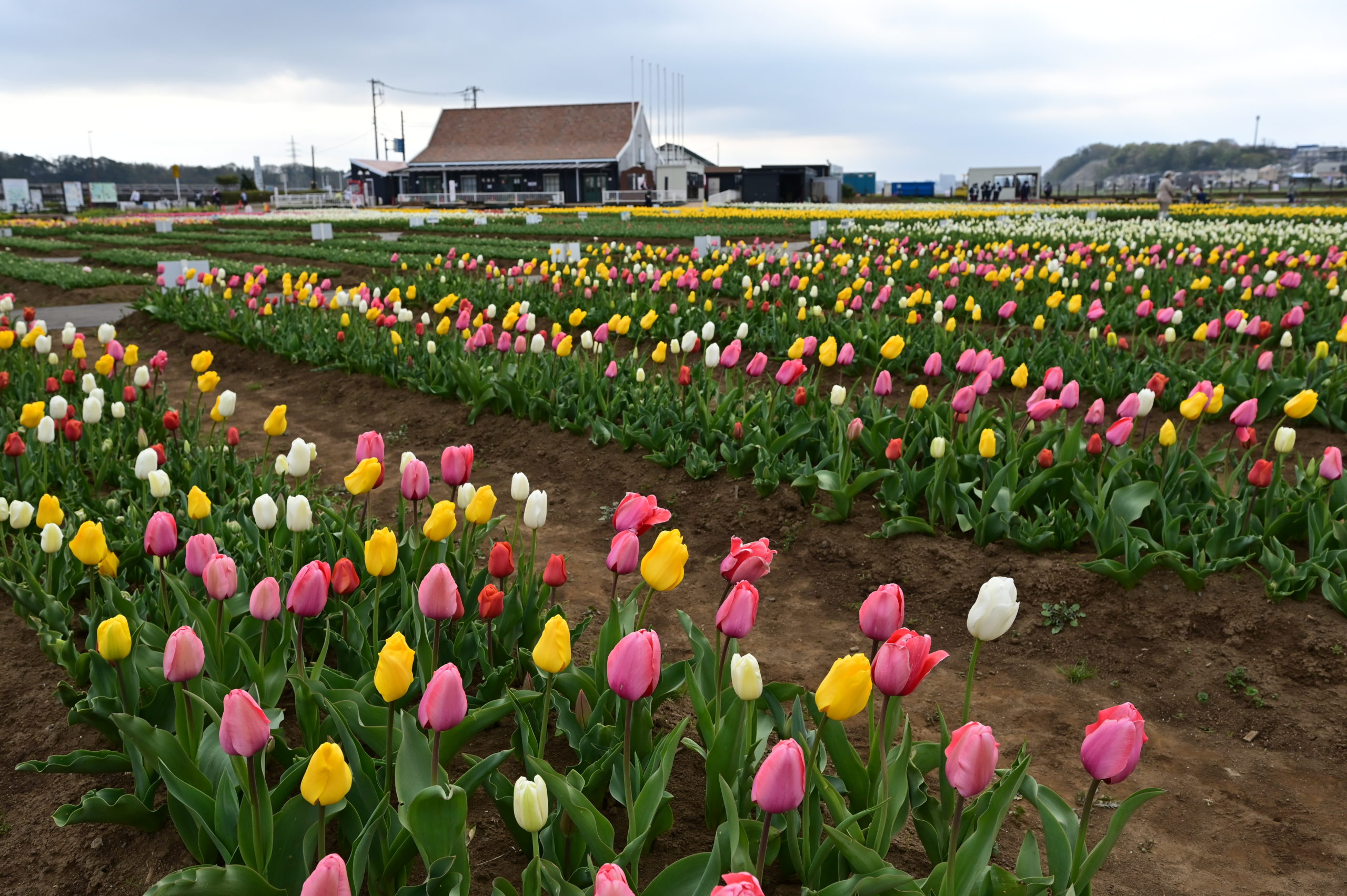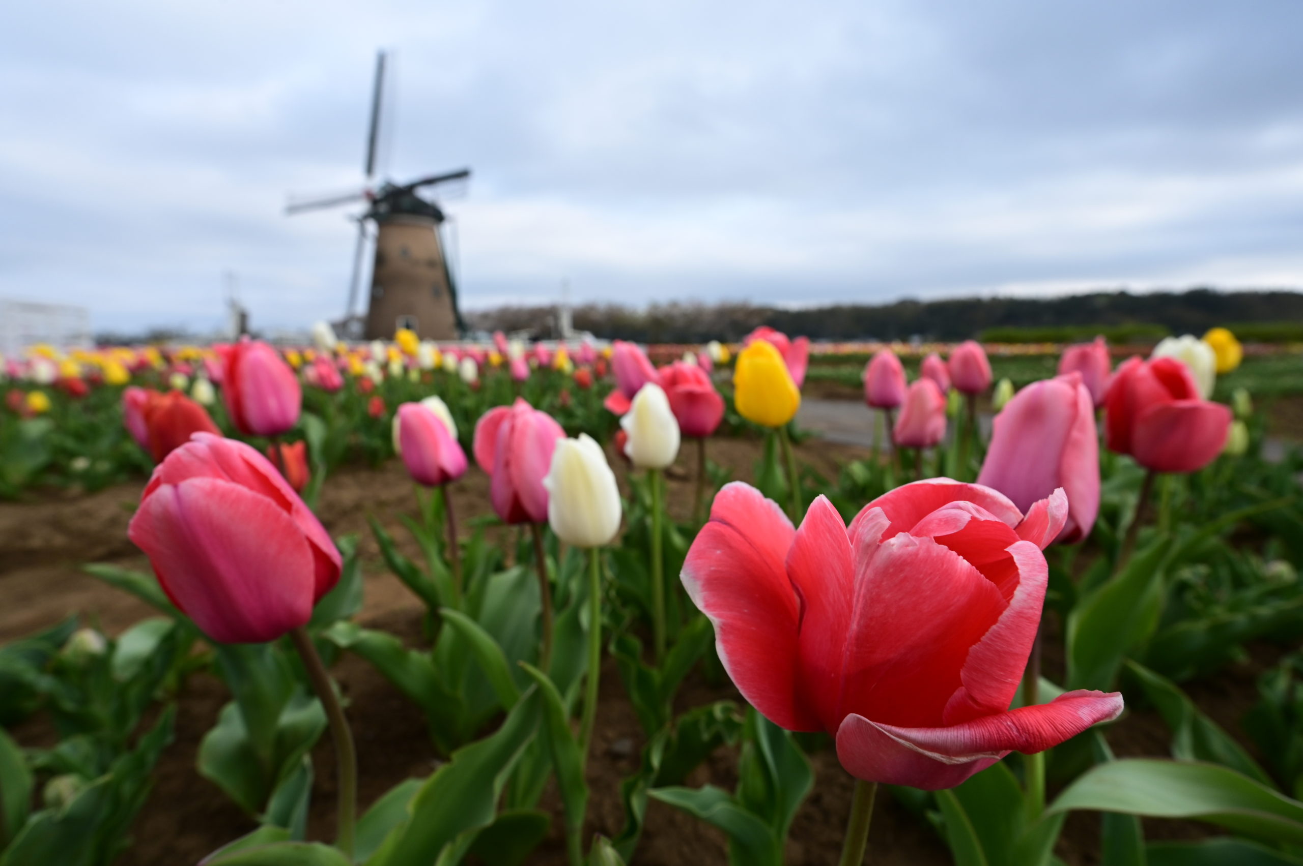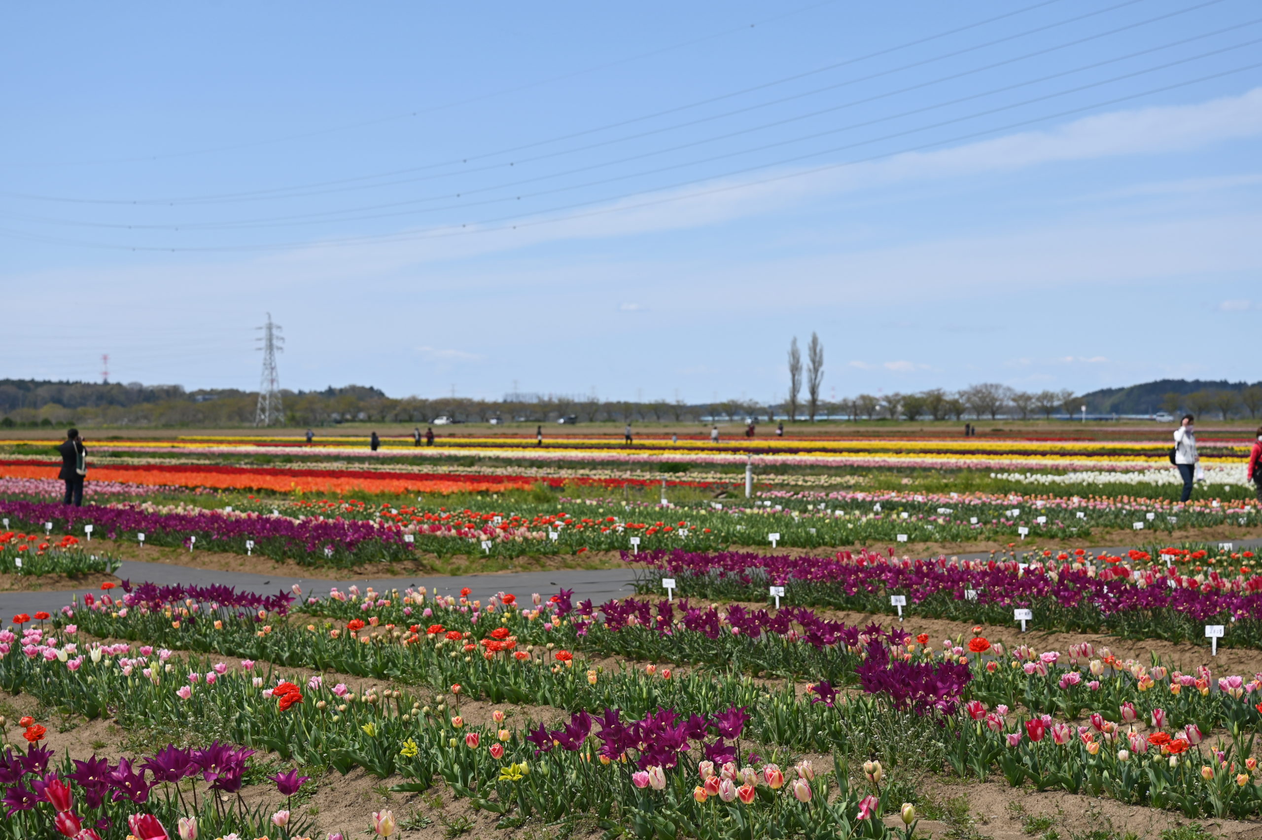 広大なチューリップ畑と大きな風車をどうやって一枚に撮ったらいいか悩む。この風車のすぐ左には大きな高圧鉄塔がそびえたっているからだ。その鉄塔を移動できないのかといつも思うが、広大な田圃であったろうその場所を市で借り受けているのかも。