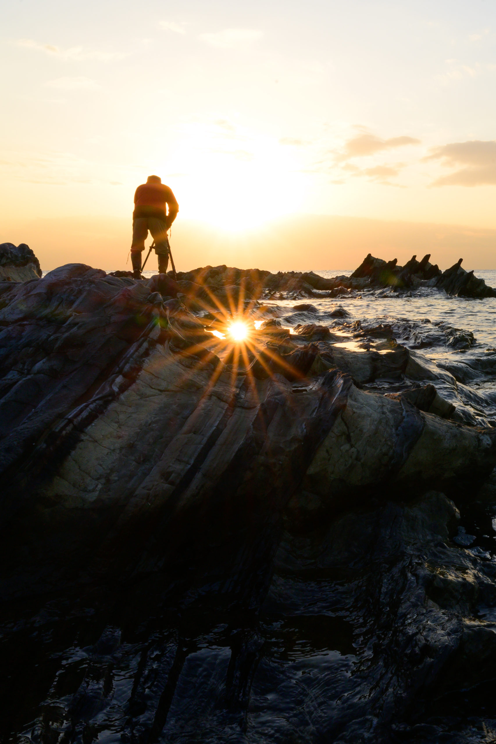 波の飛沫を狙って待っている時、水たまりに太陽が光っているのに気づく。光芒出るかも?、とすぐにカメラの位置をずらして撮った。これなら縦構図が良いか、と雲台を動かそうとしたらもう太陽は位置がずれてしまって、水たまりには写り込まなくなった。だから3枚しか撮れなかった。露出変えるゆとりもないままに。でもってこれは横構図を縦に切り取った。