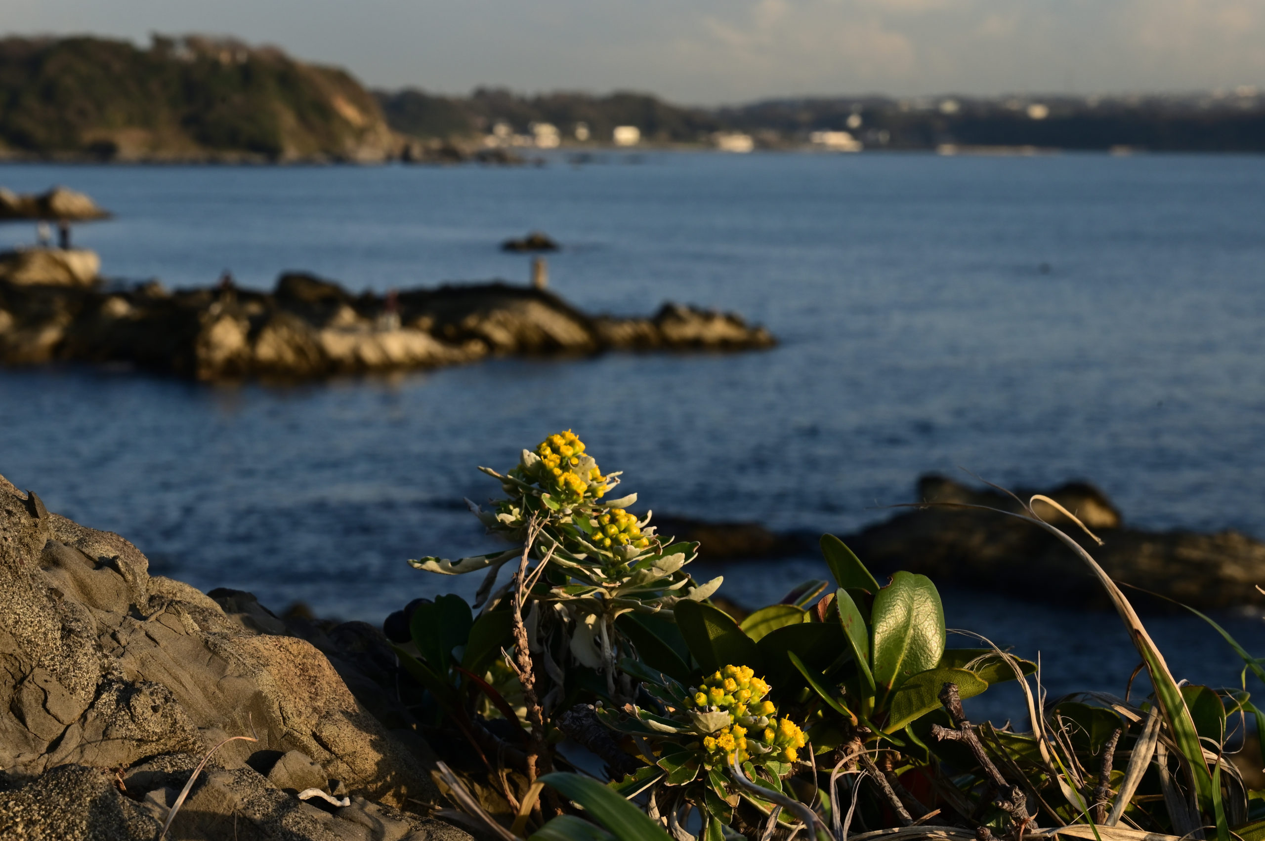 三崎口駅からバスで30分ほどかかって、バス停「荒崎」(終点)に到着。砂岩の削られたような海岸とその周辺の小山、展望台などがある公園にもなっている場所だが、公園にはいかなかった。釣り人もいない方へ行って3か所ほど先生に撮影ポイントを教えてもらい、前もって学習したように撮影する。