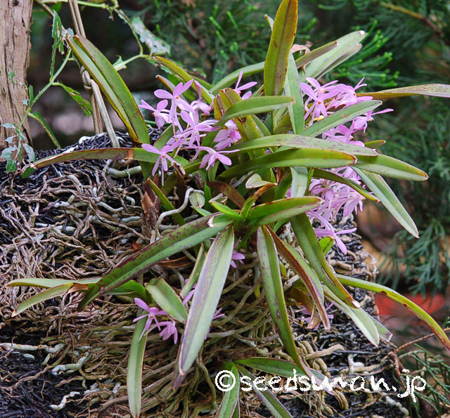 ヘゴに着けて何年になるか。。。 数年前に大きくなりすぎていたので、芽をとって分割した。 だから大分小さく(半分以下)なっているが、放任でもこれだけ回復している。 ランっていうのは意外に強いんだな。 肥料もほとんどやってないのに。 この画像は色相彩度を上げて少し加工してある。 曇りの日だからか、ピンクが綺麗に映らなかったので。
