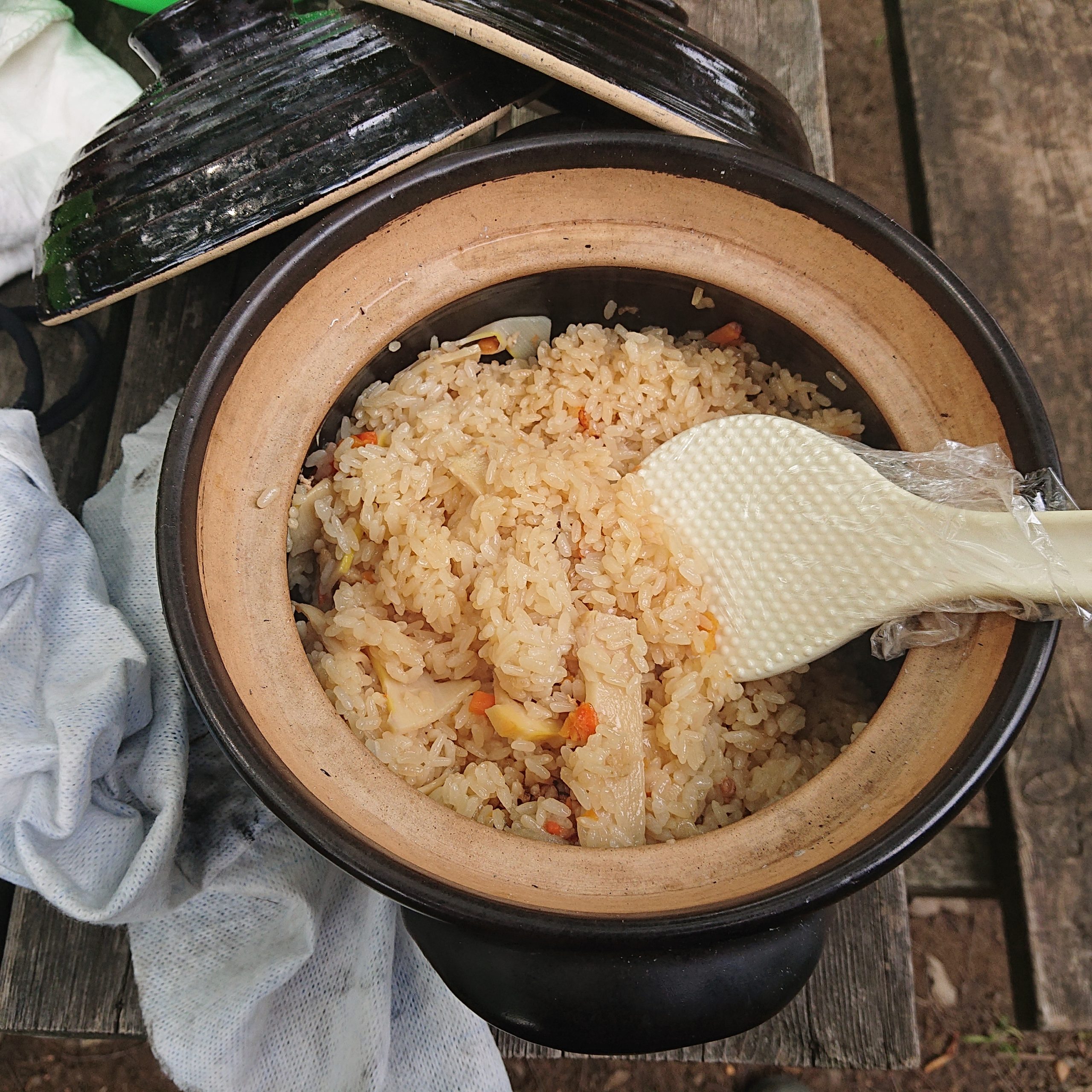 大きい薪の竈では土鍋で釜めしを炊き、ダッチオーブンのスキレットではホットケーキミックスで蒸しカップケーキを作った。