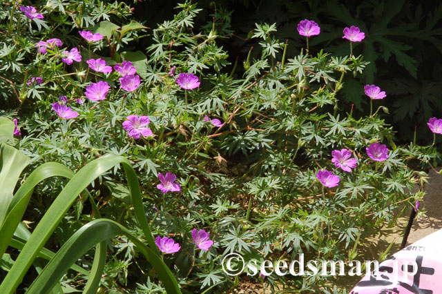 この記録の実生株。 どっちがどっちだかわからなくなったが、ここに6-8株位は植えてある。 別の場所にもマゼンタと白が咲いてるし、ここで白花も咲いてるのでもうごっちゃ。 記録はともかく、咲けばいいじゃんね。サンギネウム種は栽培してわかったが非常に丈夫で園芸植物として優秀。 特に、這い気味にはなるものの30-40センチ位の高さまでで、花は次々に咲き続け、移植しても根が少しでも残ればそこからまた芽を出す強健さがある。 だから気軽に移植できるし、半日陰くらいでも咲くから、狭いうちの庭でもOK。