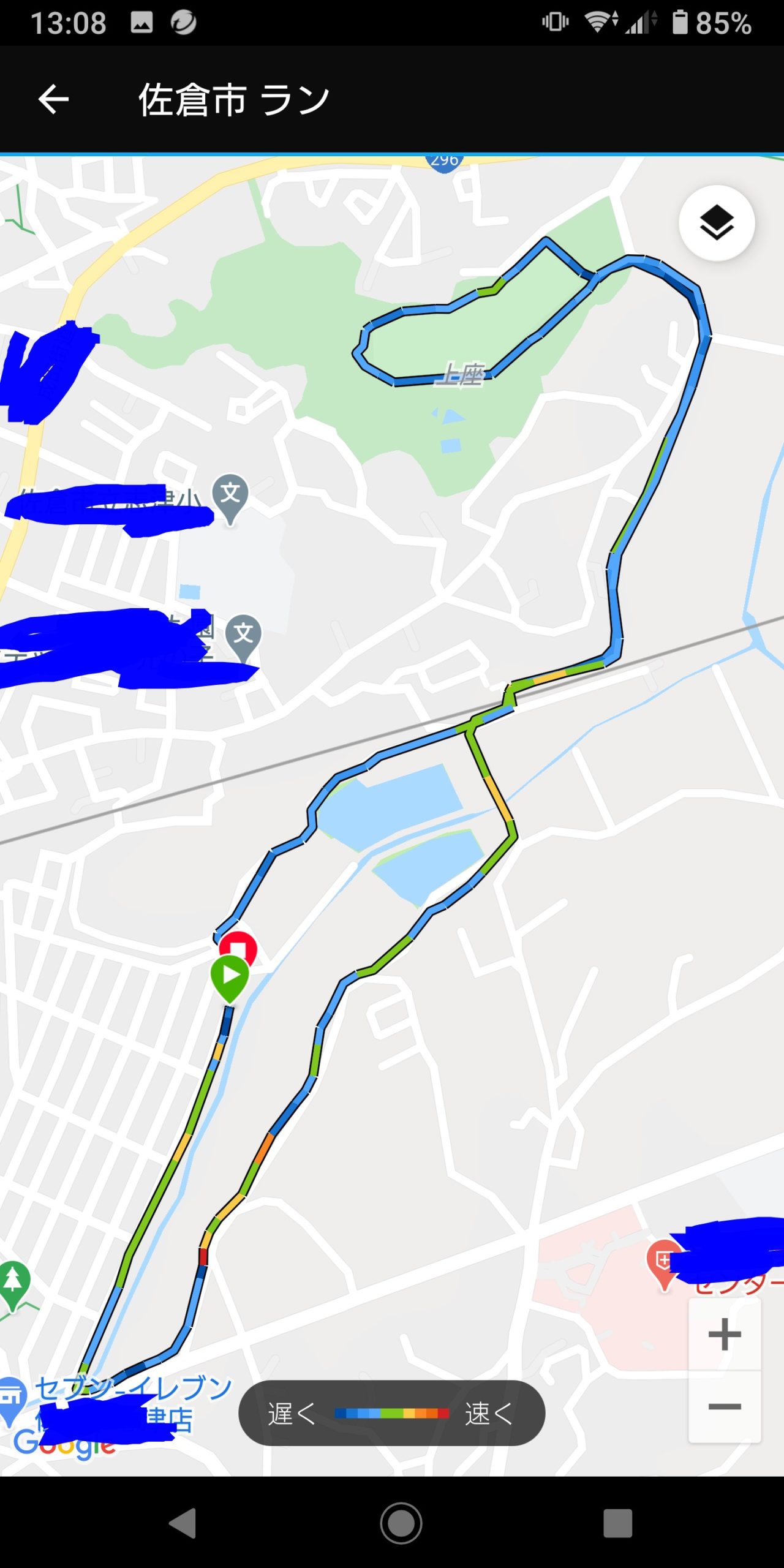 ガーミンのGPSウォッチはGPSが途切れることはなかったが、拡大すると道がずれていることもあった。その点今回はきちんと地図の道をなぞっている。