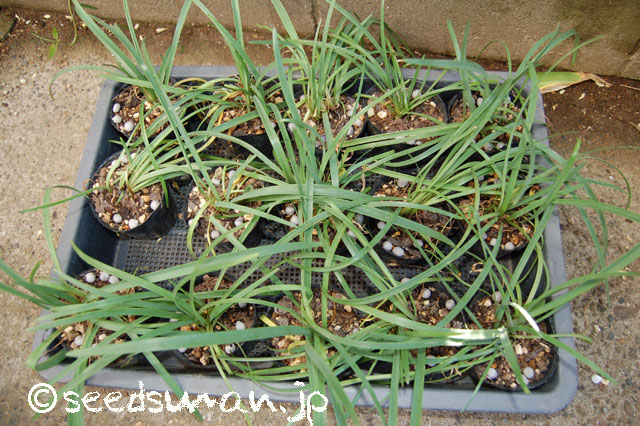 ラベルには「ユリ科不明」と蒔いた日付だけがかかれていた。記録にも「ティッシュで包まれてテーブルにあったがなんのタネか分からない、とあった。我ながら呆れた。発芽すればわかるだろうって書いてあるけど分からなかった。あまりに混み混みだったから分けてやろうと鉢を開けたら球根がぎっしり。ラッキョウのような形で直径は1-2センチ。旺盛な生育だからてっきりツルバギア・ビオラケアだと思っていたが、葉っぱをちぎって匂いを嗅いでもニラ臭がないので違うと判断。そしてこの間植え替えた球根のハブランサスのことを思い出した。あれにそっくり。