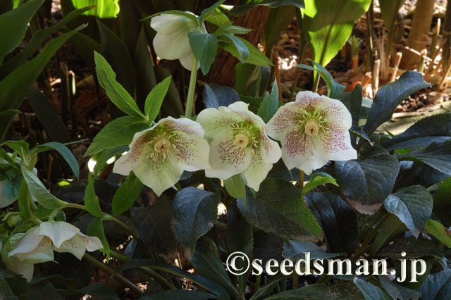 濁りのない白の花弁に ピンクのスポットが かわいい。 葉色が濃い暗緑色で、 ほかのスポットタイプと 見分けがつきます。 純白もいいけど、 これはこれでいいですよぉ。 好きなヘレボです。 写真を撮るために、3個の花にはこっちを向いてもらいました。でないと、みんな下向きですもんね。