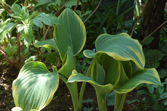 このギボウシがこんなに大型とは思わなかった。 何しろ葉柄を含まない葉の部分だけで、 長さは30センチ近くある。 葉柄はもっと長くなるので、 葉の全長は60-70センチにもなろうか。 もっと広い場所で悠々と育ててやりたかった品種だ。大きな木の下にでも植えたら、さぞや見事だったろうね。こんなごちゃごちゃした場所にはそぐわないね。