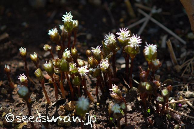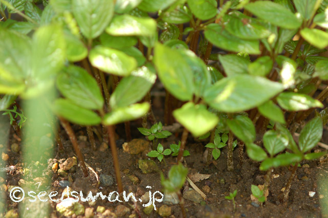 株の中心部の見えにくいところに、実生と思われる小さい芽がいくつも見える。良く見れば30-40センチ四方にこぼれて発芽している。こうやって増えていくんだなー。どうぞご自由に。