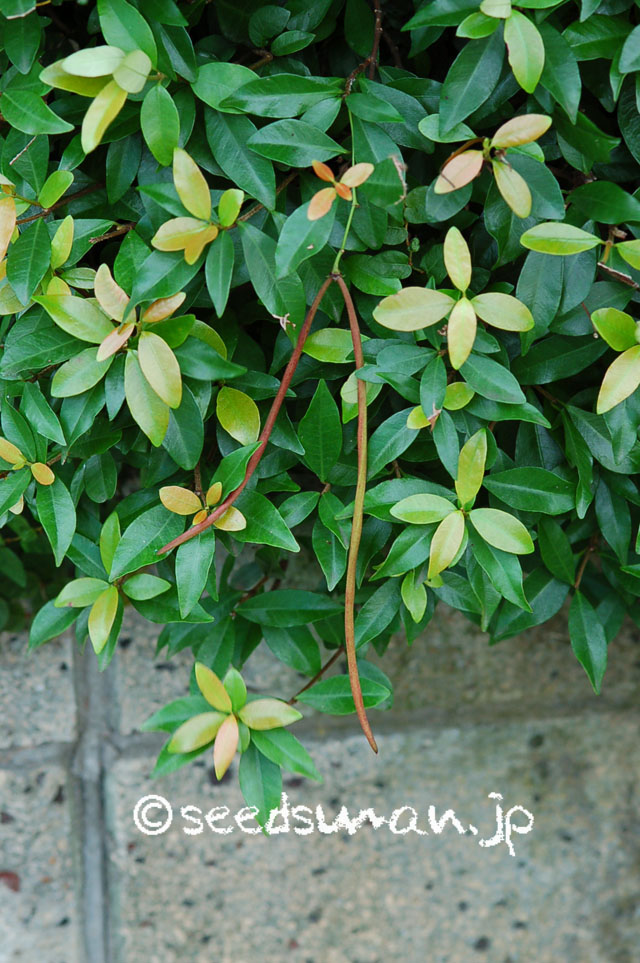 花が終わった後は、直径4-5ミリほど長さ15センチ位の細長いサヤができる。その中に、小枝状の長さ1.5cm位のタネが縦に並んで詰まっている。テイカカズラのタネは、絹のように輝くタネよりも大きな(長い)綿毛がつくのだ。その綿毛がフワっと開いたとき、落下傘のように風に乗って飛ぶ・・・んだろうなぁ。。。(^_-)