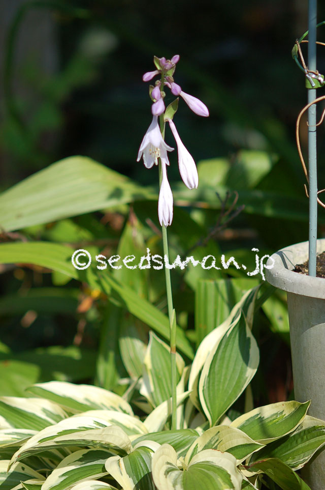 ホスタ ‘パトリオット’ KD2購入株198円 移植:2011.9.11 開花:2012.9.14~一度死にかかったホスタ‘パトリオット’が復活、ばんざい。 去年の今頃、地上部が全く無くなっていてあわてて根を探し、ずいぶん大株になっていたのにほんの少しの根だけが生き残っていたので、それを掘り上げ容器栽培とした。 その死にかけた株が、花茎1本だけだけど花を着けてくれた。