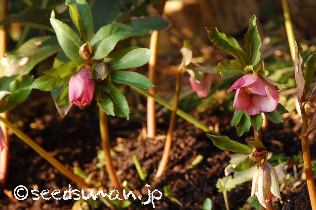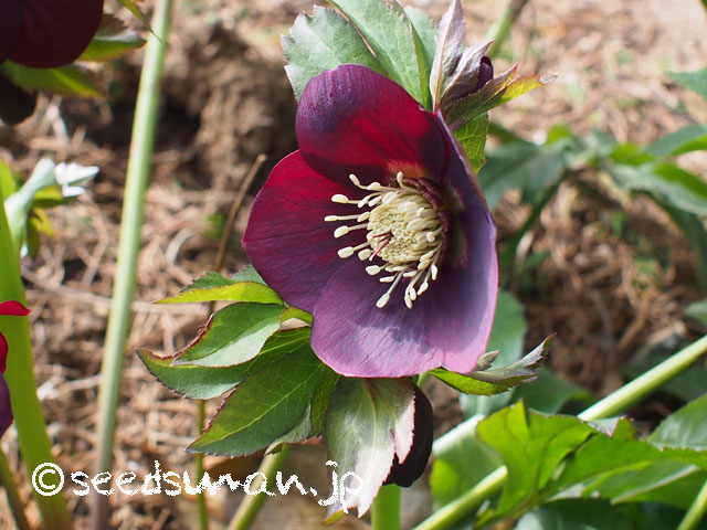 開花:2009.2.13~Haruさんからもらったのは、実はHelleborus atrorubensかもしれないね。オリエンタリスでこんな単色の花ってなかなかないもの。アトロルーベンスの画像を検索するとこれとそっくり。だが、KD2で買ったほとんど同じ色の株には、アトロルーベンスというラベルはついていなかった。なので、交配種でこういう色が出ないとは限らない。赤色系の交配親といわれるアトロルーベンス種の自家受粉なのかは不明のまま。