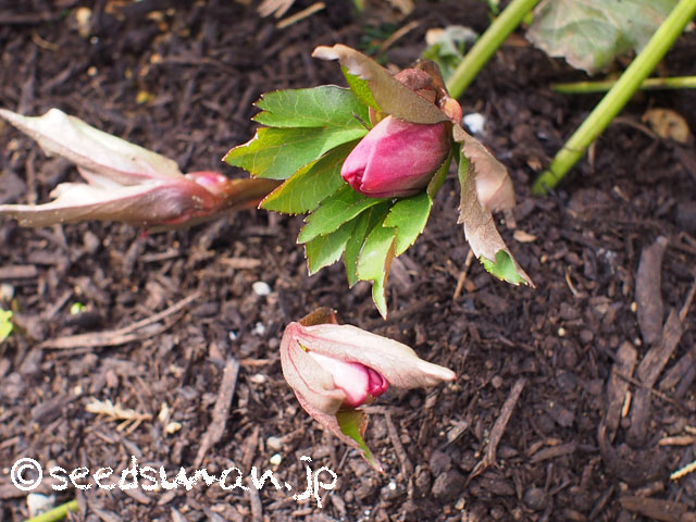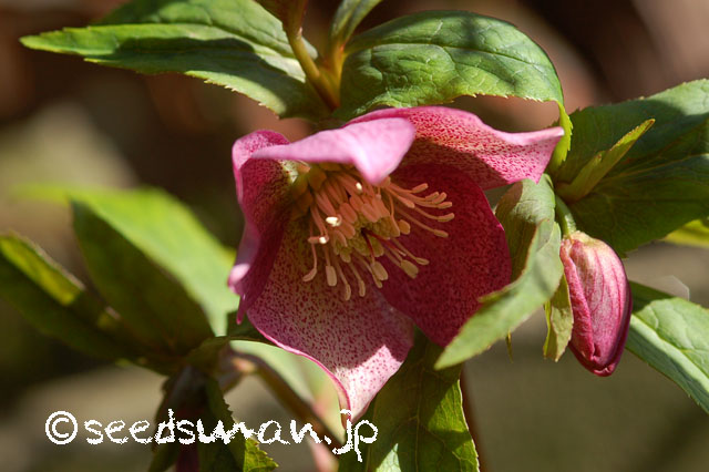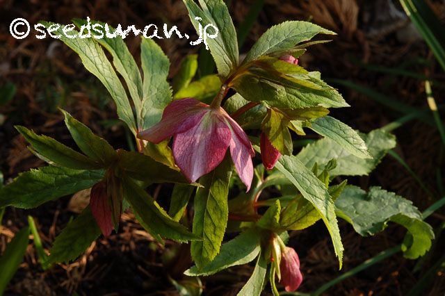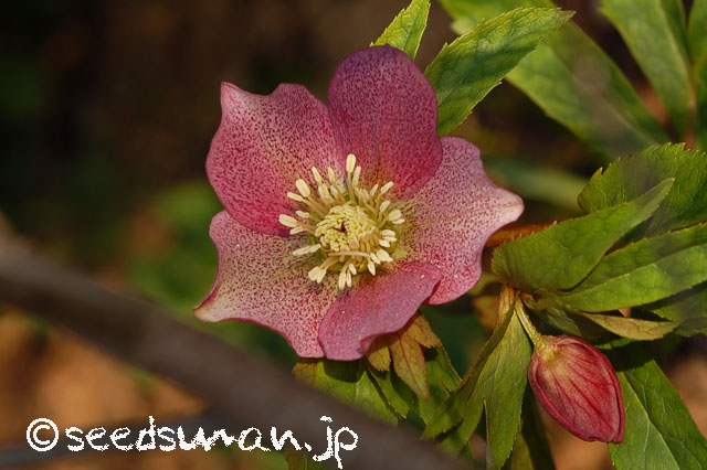 4P譲渡:2011.5.17 開花:2014.3.15~クリスマスローズの実生株の中で、今年初開花だからこの記録のものだと思う。ルーセローズと混ぜて蒔いた時点で花には期待していなかった。だが思いのほか明るい桃紫色系で、スポットが多く、弁端は尖り、大輪だった。サンショウの木のそばに植えてある。山椒はまだ芽が出ていない。