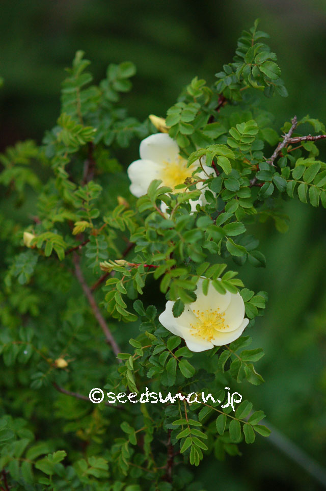 去年は株を小さくしようと、大分枝を切ったし根も小さくした。 なので花はほとんど見られないと思ったが、シュートにはちゃんと花をつけた。 今年は色が薄い。 そうそう、肥料やってないからね。 この薔薇もいかにも原種のシュラブで、肥料が効いていれば枝をたくさん出し、花見が思うようにできなくてもすぐに大株になりそうだ。 とげが強いので結構気を付けないと怪我をする。 でも花色はソフトはペールイエローで、一重でしべが多いのも気に入っている。 新枝が赤いところも好き。