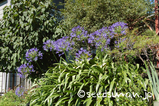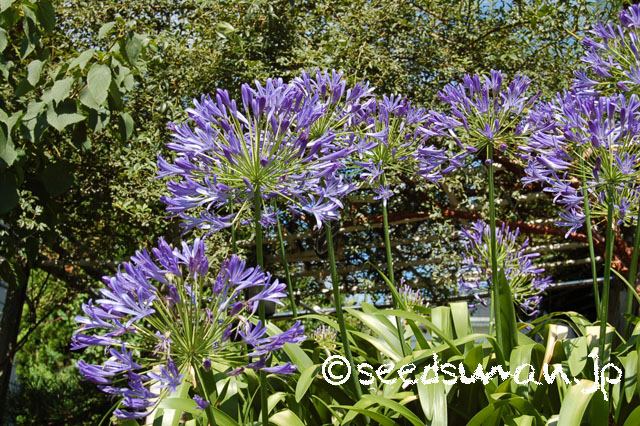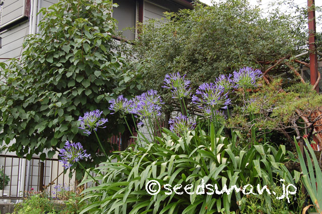 アガパンツス ‘紫宝殿’連日の蒸し暑さの中、大輪の濃い青紫色花は清々しい。 アガパンの中でも晩生種で、しかも大型種。 買った当初は小さい株分け株がたった1個だった。 冬は霜から守り、夏は直射日光に気を付け・・・と、他の植物よりも特に大事にしていた。 これだけ大型(横幅2メートル以上)になった今となっては、我が家ではちょっと邪魔者扱い。 晩秋になって根の吸水が収まるころ、株分けしちゃおっかなー。 そんでもってヤフオクで販売しようかなぁ。。。
