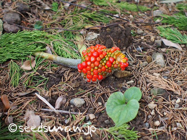 直径8センチもあった球根1個をルーマニアのキャリンに送り、残っているのは大きい球根1個と、ごく小さい葉っぱが一枚出るだけの小球が1個。大きい方のは毎年仏炎苞を出すが、去年もそして今年もこのような赤いタネ?がついた。アリサエマの特徴として雌雄異株らしいのに、花が1個だったから他花受粉していないことは確か。よって今年も発芽はしないだろう。だから、タネを山草会に送ることもできないわ。