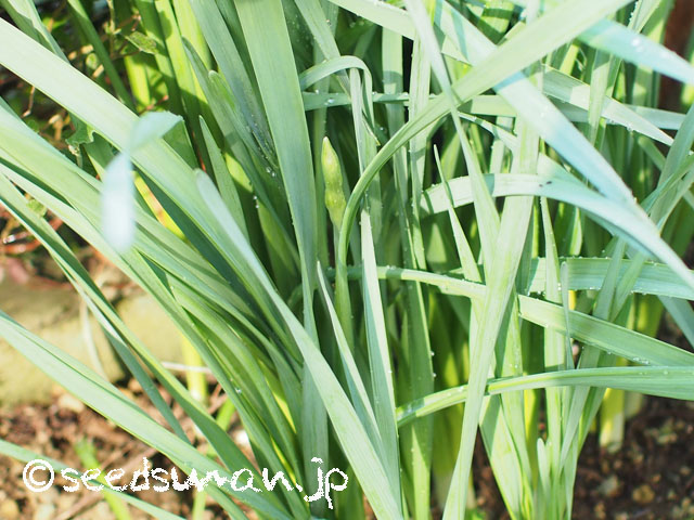 建物の南面に植えてあるが、西に垣根がある所なので午前中も午後もそれほど日当たりは良くない。でも、東側で午前中たっぷり日が当たるスイセンよりも、早く芽が出てもう蕾が見える。東側のスイセンはまだ5センチほど。ニホンズイセンはスイセンの中でも12-2月ころから開花が始まる種だった。香りもあって寒さに強い。なるべく車を入れる時に踏んづけないように気をつけなきゃ。
