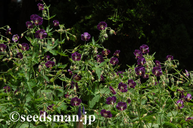 ゲラニウム ファエウム ‘サンボー’ (クロバナフウロ)満開のようにも見えるけど、まだまだこれからです。 とても開花期の長いロングランで丈夫なハーディゲラニウムです。 千葉の夏でも平気でしたから、暑さにも比較的強いといえます。 花は小さ目ですが暗紫色の花で、ちょっと変わっているので人目を惹きます。 チョコレート色の斑が入る葉もなかなかなんです。 うちでは通りがかりの園芸好きの方の目によく留まり「珍しい花ですね」と、声をかけていただきます。 株分けで良く増えるからこそ、最近は増やす気がなくて株分け・植え替えもしてないですが、今年こそはしなければならないころあいです。